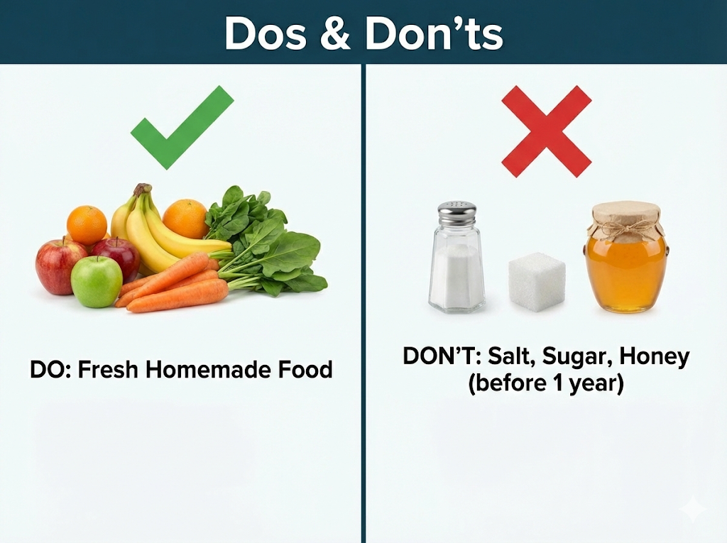 | Fresh Food: हमेशा ताज़ा, घर का बना खाना दें। | No Honey: 1 साल से पहले शहद बिल्कुल न दें (botulism का खतरा)। |